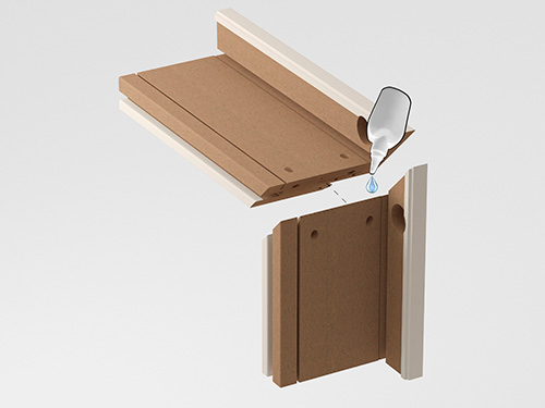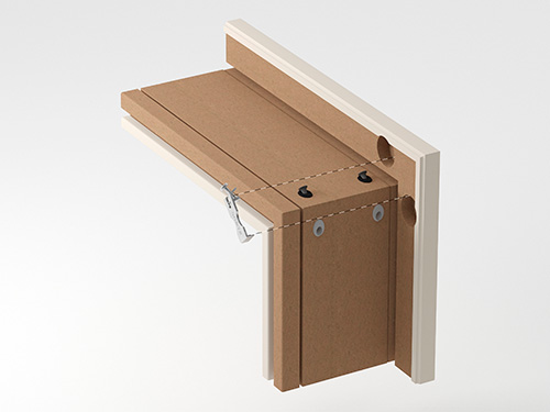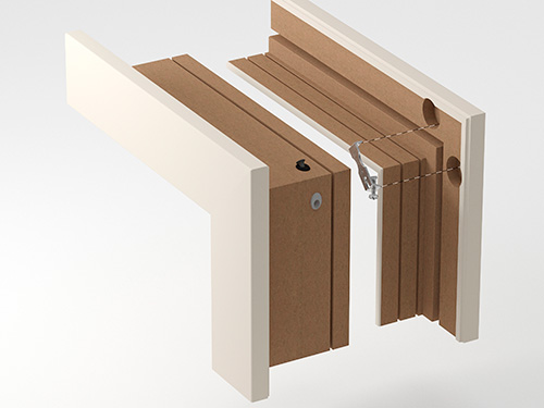 Соединение коробки и наличника осуществляется при помощи немецких комплектующих: шкантов, фиксирующей скобы и специальных металлических клипс, что полностью исключает смещение частей конструкции относительно друг друга во время установки и эксплуатации.